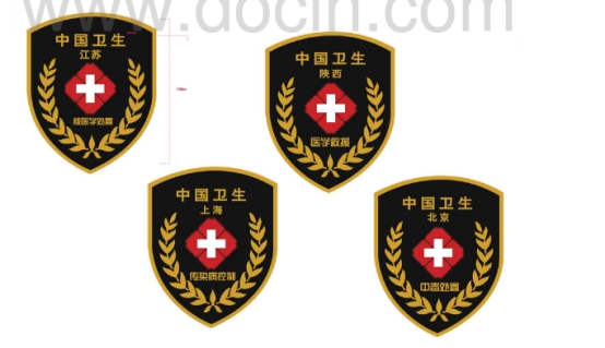 臂章正面中間位置印有“紅花白十字”,圖案上面兩行文字,***行是“中國衛(wèi)生”,第二行是承建單位或隊(duì)伍所在省份名稱;圖案下面一行文字說明隊(duì)伍的處置類別(如醫(yī)學(xué)救援等);兩側(cè)設(shè)計(jì)有環(huán)繞的麥穗圖案。